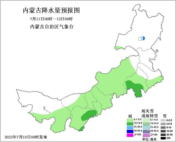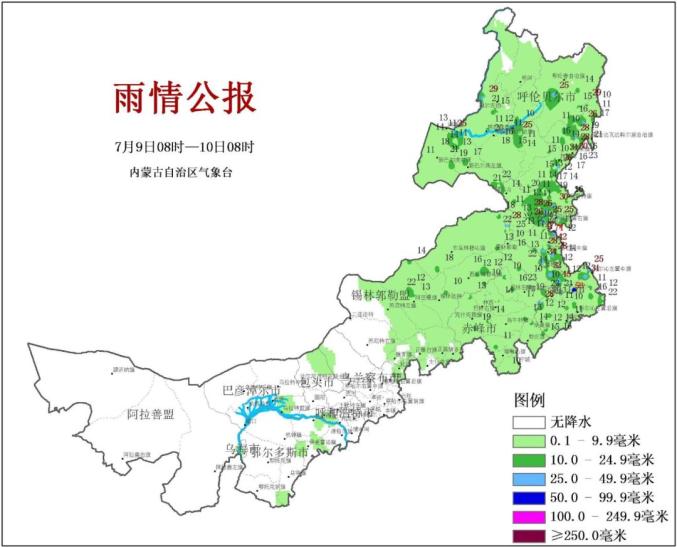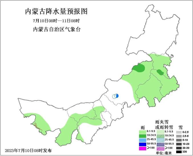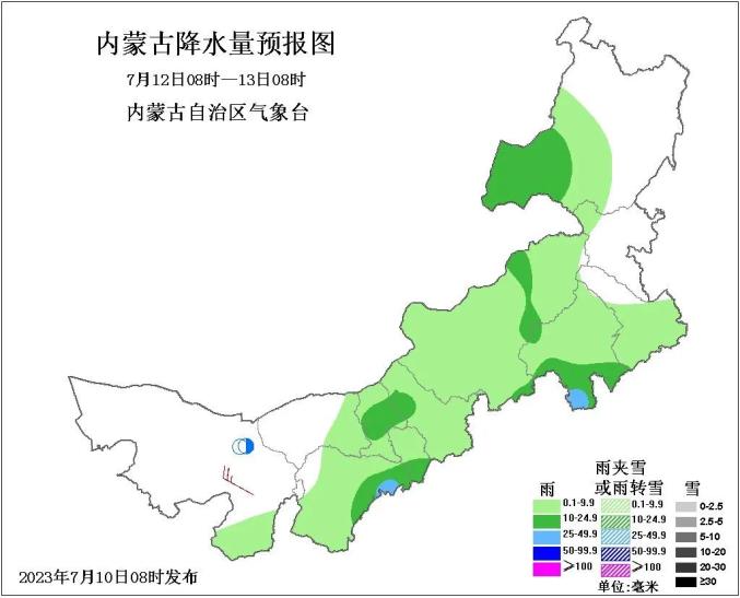 今天(7月10日),内蒙古持续西部高温东部雨的天气格局。预计,今天乌海市、巴彦淖尔市、包头市等地仍有35℃以上高温天,局地气温可达37℃以上,公众要做好防暑降温措施,谨防中暑。同时,今后三天,受高空槽(涡)和地面气旋共同影响,内蒙古自西向东将迎来大范围降水天气,其中,西部偏西南和偏东、中部偏西南、东部偏西和偏北地区有大雨,并伴有短时强降水、雷暴大风、冰雹等强对流天气。公众需及时关注预报预警信息,警惕强降雨和强对流天气可能引发的山洪、城乡内涝等,远离气象灾害风险较高的地区,同时关注强降雨对交通出行的不利影响。
